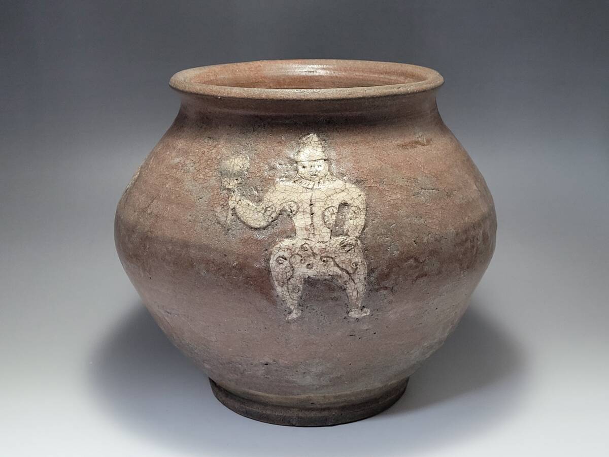 > ● 幅 約 25.7cm 白土で表現された人物の姿が神秘的で独特な 時代 マヤ文明 人物文 陶器 壷・花瓶 飾瓶 花插 花器 唐物 人間国宝 李朝 ●