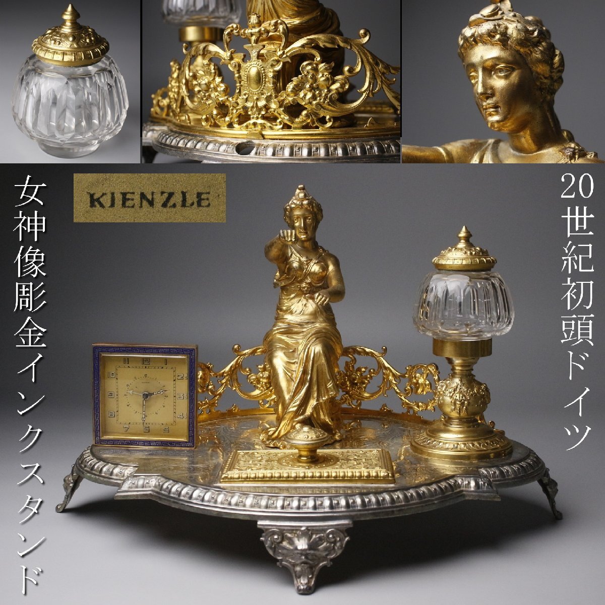 > 【LIG】20世紀初頭 ドイツ 女神像 彫金インクスタンド KIENZLE キンツレ 時計付 細密造 アンティーク [.YQ]25.11