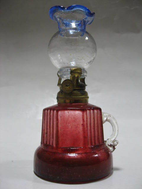 - ★明治後期 青縁金魚火屋&六角丸底油壺の豆ランプ 和ガラス灯火器レトロ照明古道具型吹きエンボス三平舎★