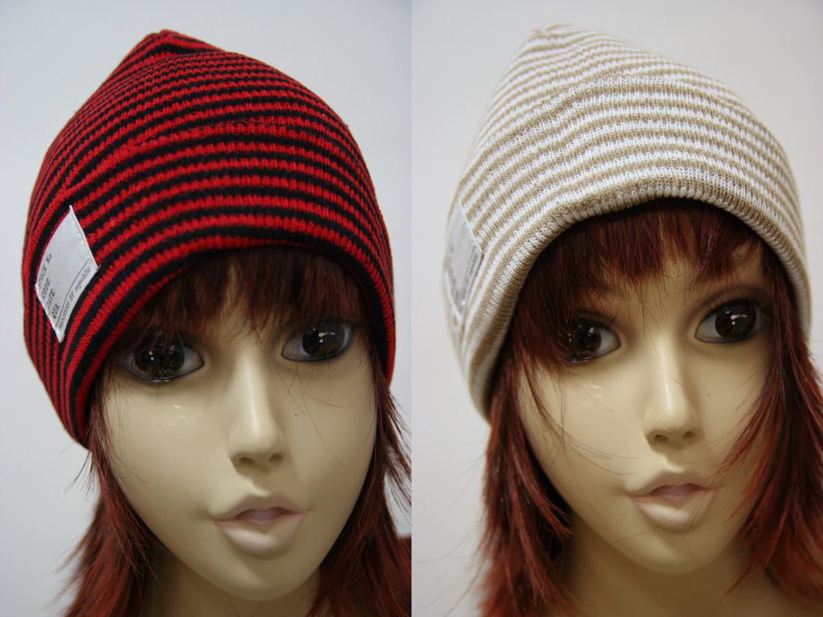 - 送料無料◆2色組◆通年タイプ◆フリーサイズ◆男女兼用◆綿混素材◆コットン75%配合◆ボーダー柄ニット帽(レッド&ベージュ)