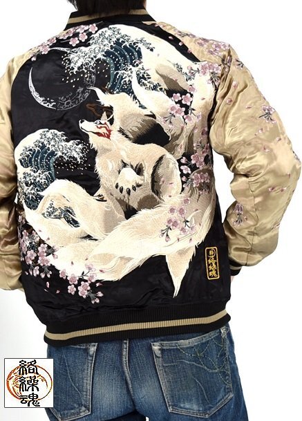 - 粋 三日月に九尾リバーシブルスカジャン◆絡繰魂 B色 Mサイズ 254013 和柄 和風 刺繍 狐 きつね キツネ 妖怪 スーベニアジャケット