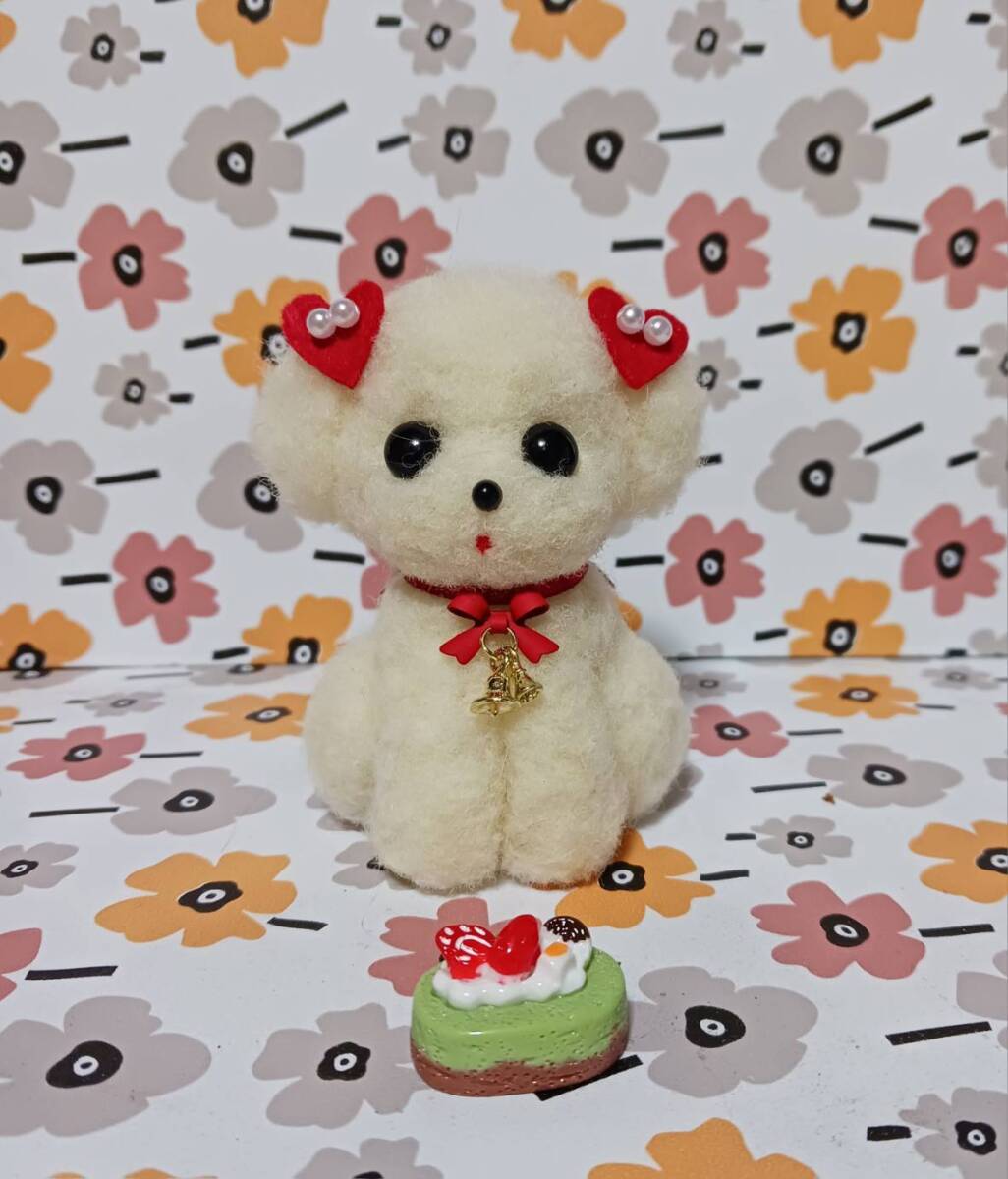 - ハートの耳飾りの似合うかわいいマルチーズ ケーキ付き 羊毛フェルト