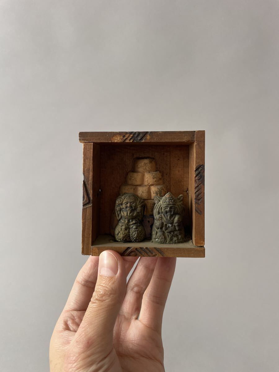 - 木箱入り 大黒 恵比寿 / 厨子 仏像 彫刻 民衆仏 人形 豆人形 縁起物 東洋 古美術 古民具 古民芸 古道具 侘び寂び 豆仏 神道 呪物 枡 土人形