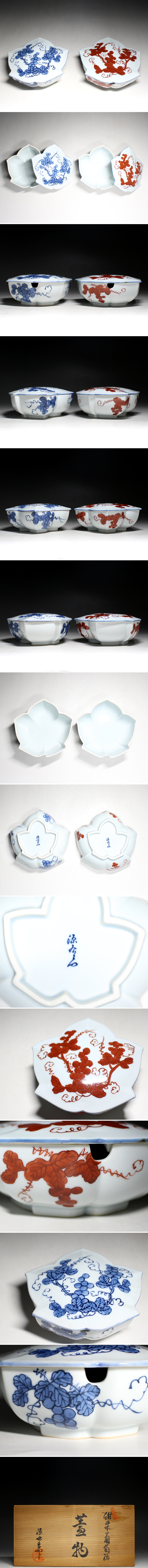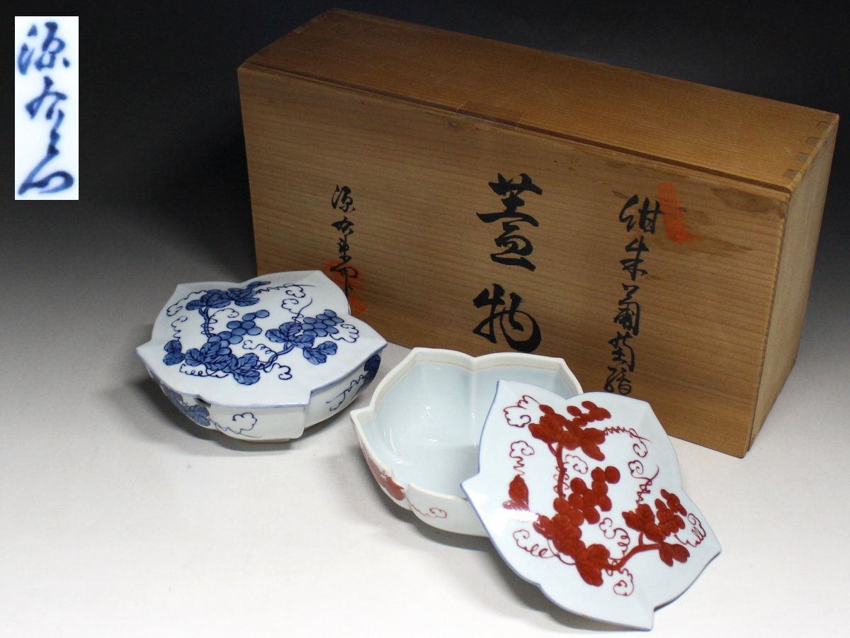 - ◆有田・館林源右衛門・是米木窯・紺朱葡萄絵・蓋物・器・2点・共箱◆a3509U