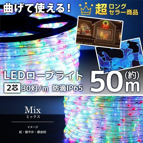 - 【ミックス】LED イルミネーション 50m チューブ ロープ ライト 防水 屋外 外壁 ベランダ 飾り付け ハロウィン クリスマス 収納リール付き