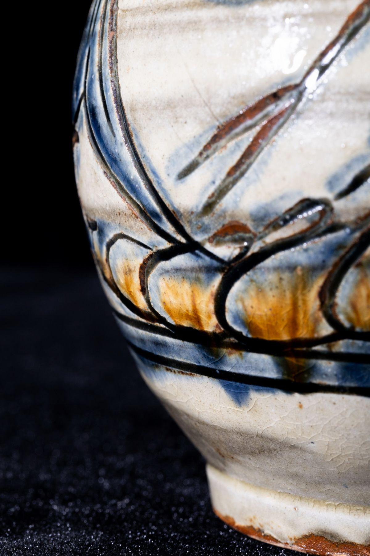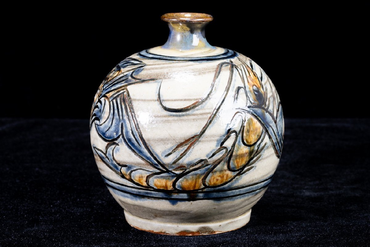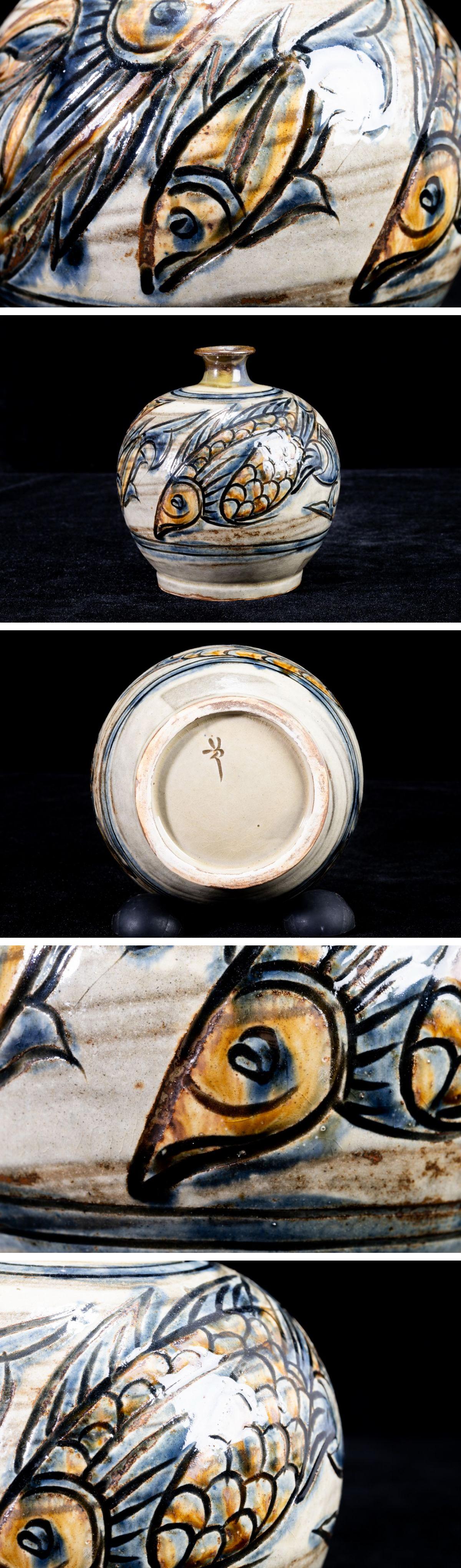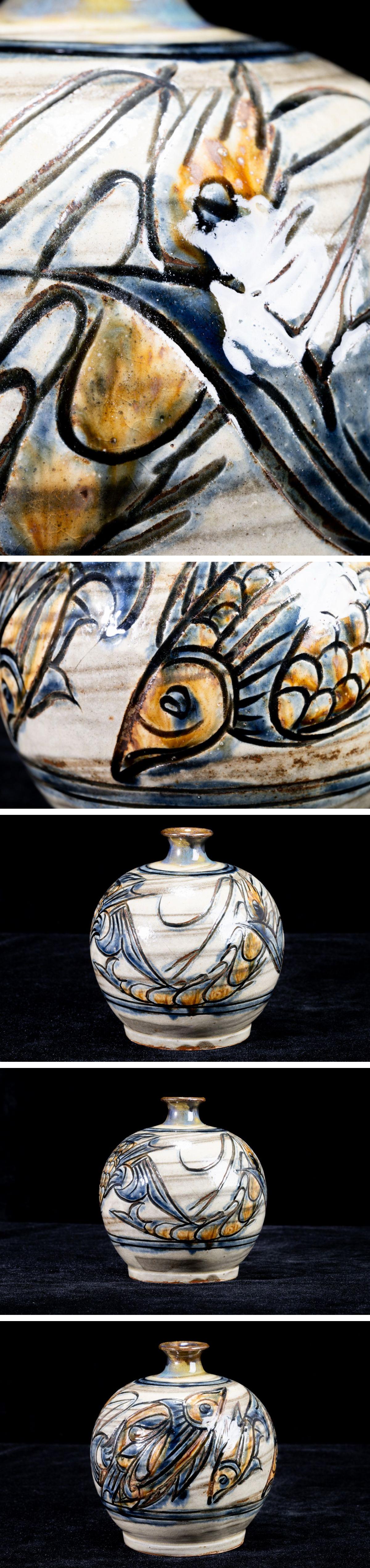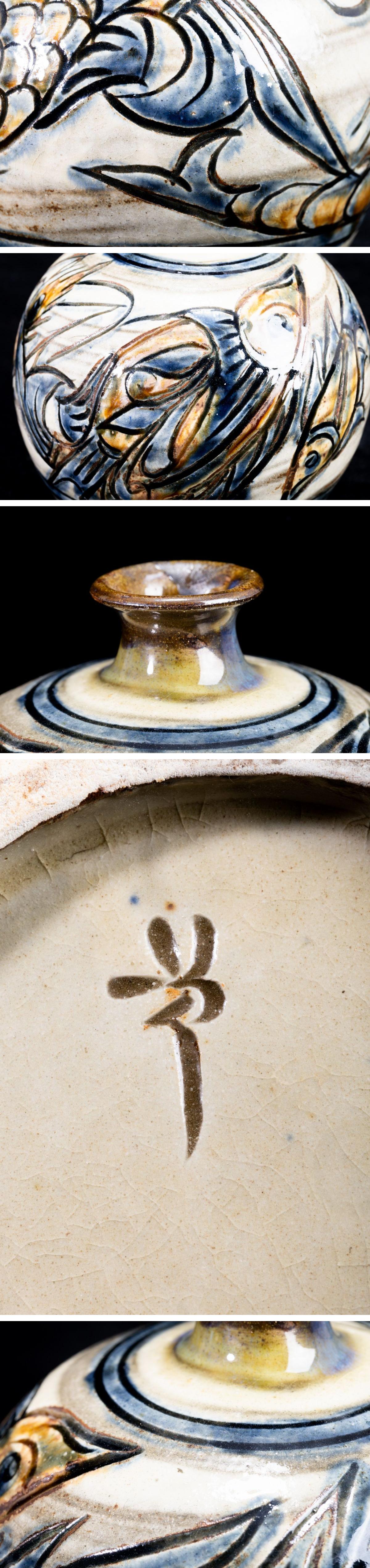 - 【珍品堂】1円から R31-V7 人間国宝 壺屋焼 琉球陶器 金城次郎 在銘 海老魚紋 花瓶 高18㎝ 壺 一輪挿し 花器 飾壺 希少 時代物 骨董品