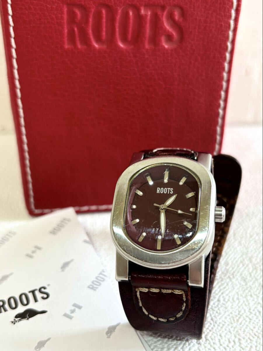- 稼働品 ルーツ ROOTS レディース 腕時計 ボルドー 赤系 文字盤 SS レザー ブレス ロゴ アナログ クォーツ ウォッチ 共箱入り保管品
