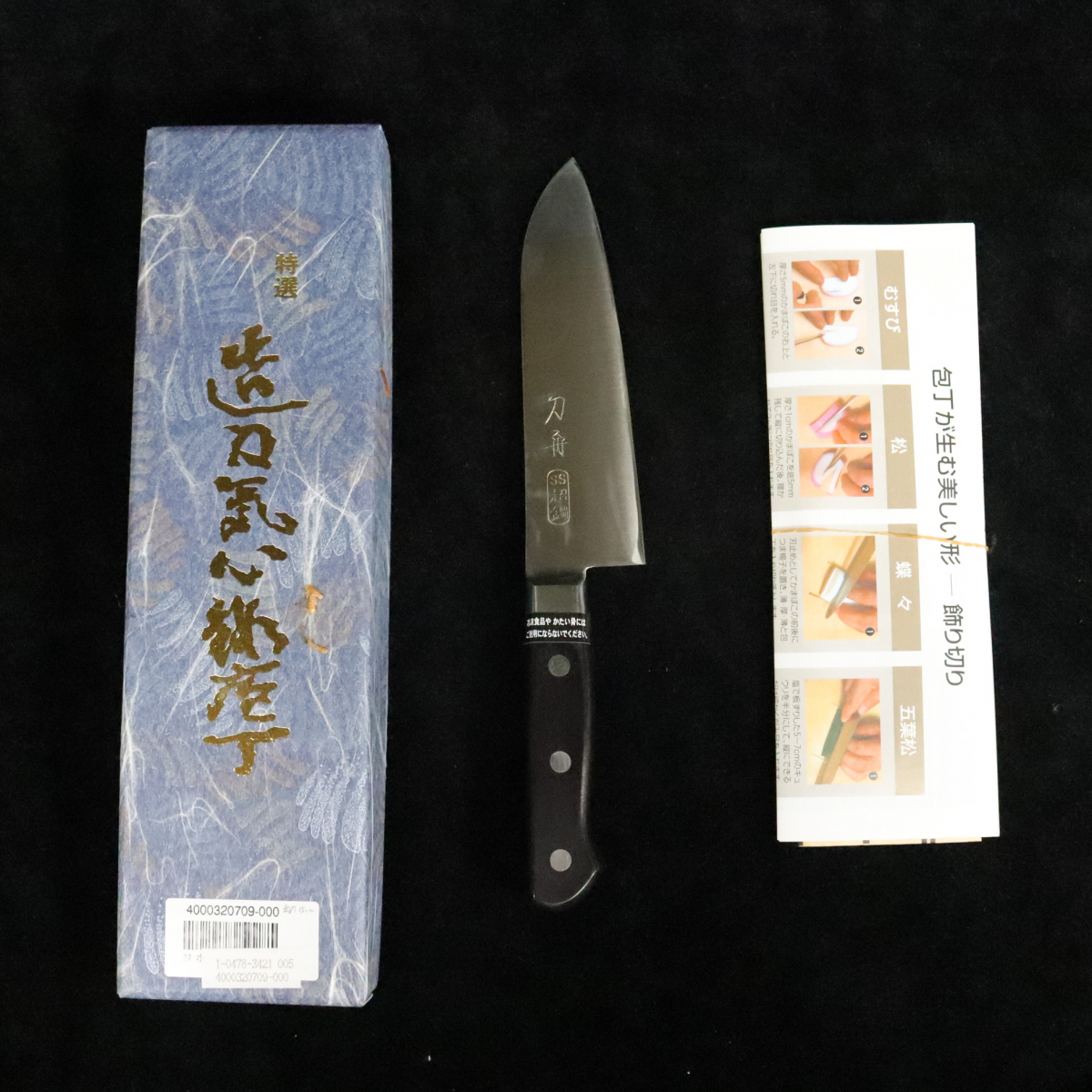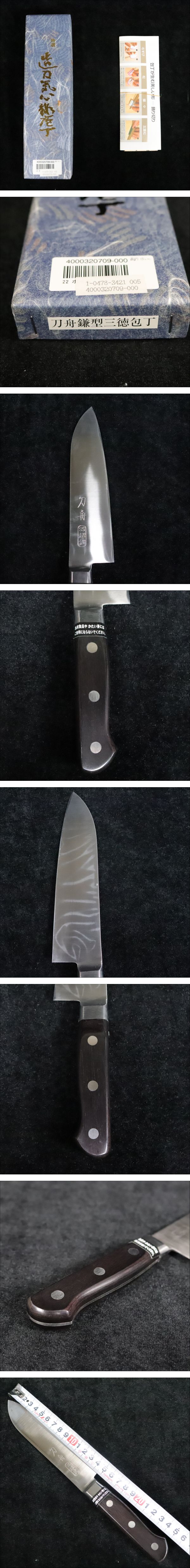 > ■【美品】造刀気心 特選 刀舟 鎌型三徳包丁 全長約26cm 刃渡り約14.7cm SS超鋼 多重層鋼 万能 元箱付き 槌目 高級 特選 _LFM_C1112-F01F