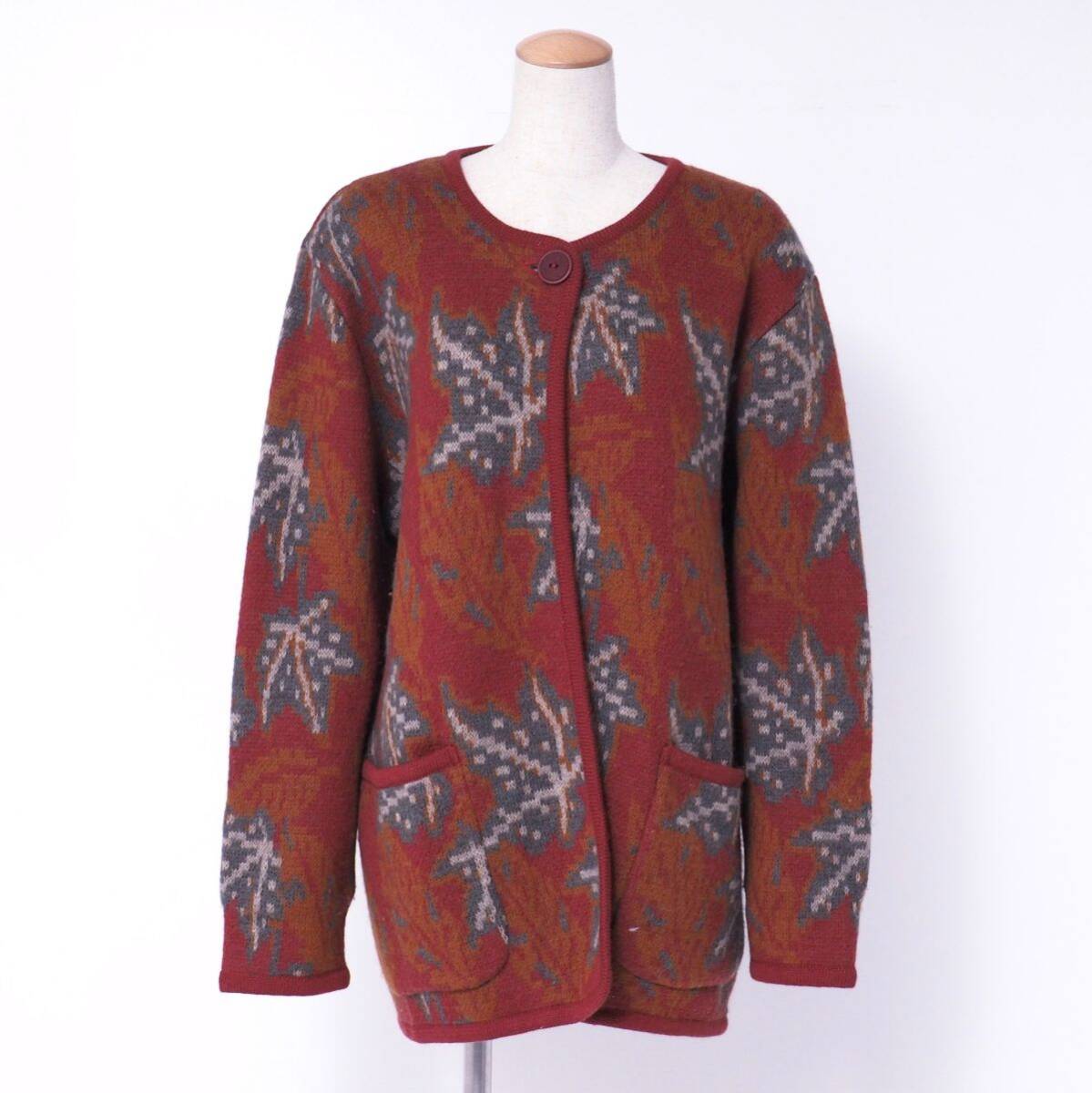 > TI6858☆ロングハウス LONGHOUSE ニット カーディガン ニットジャケット リーフ柄 総柄 ウール 長袖 レッド系 Mサイズ カナダ製