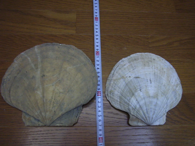 - 巨大トウキョウホタテ 殻長20cm越えの左殻 殻長18cmの右殻 偽ペアー チバ二アン期後期 千葉県産