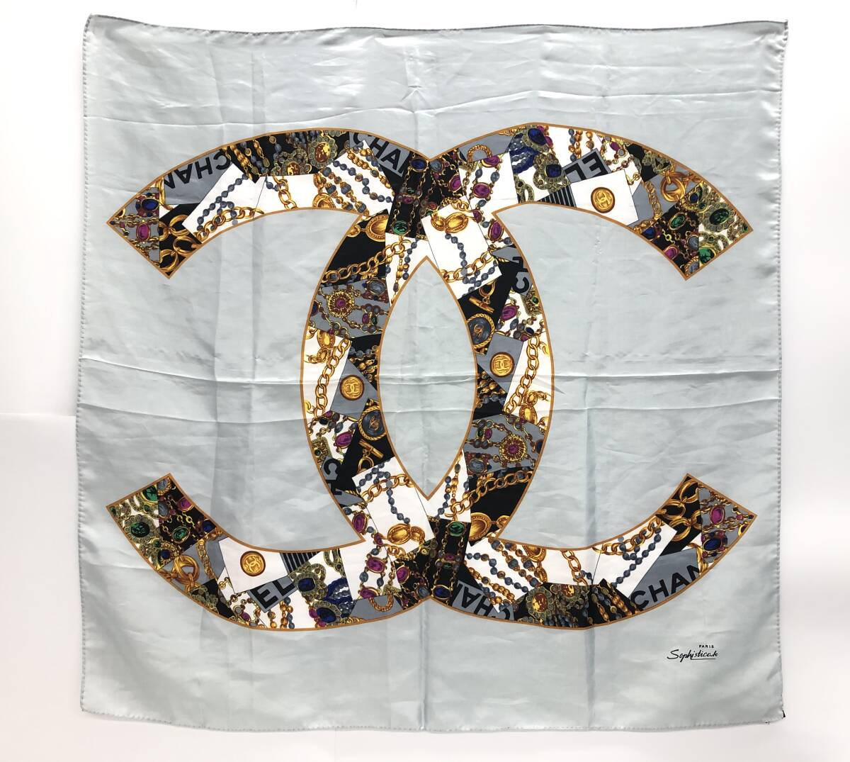 - 1円~ CHANEL シャネル Sophisticato サティフィスケイト 大判 スカーフ シルク ココマーク ジュエリー柄 ブルーグレー 88×88㎝ 正規品