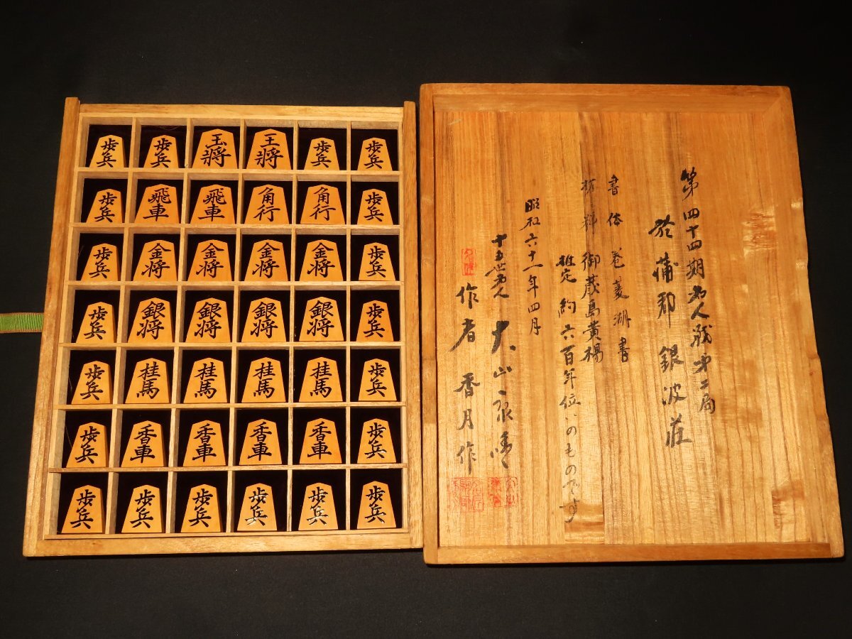 1000円スタート▲第44期名人戦採用/名匠香月作巻菱湖島黄楊斑入上柾目盛上将棋駒▲大山名人直筆揮毫展示用大型桐平箱