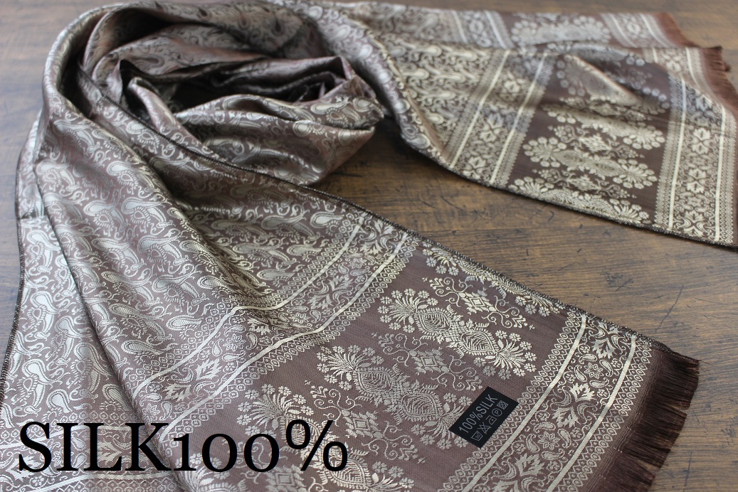 - 新品【シルク100% SILK】ペイズリー柄 シャインブラウン 茶色 S.BROWN 大判 ストール/スカーフ