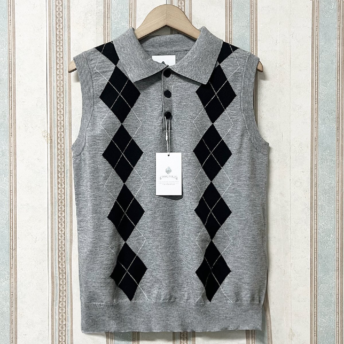 > 定番 定価4万 FRANKLIN MUSK・アメリカ・ニューヨーク発 ベスト ニット ウール混 柔らかい 折り襟 アーガイル柄 トップス インナー サイズ2