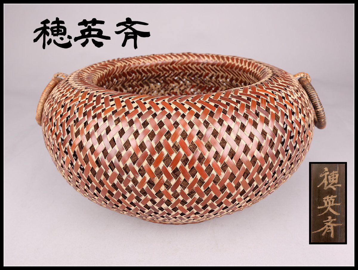 【志】A272 名工 【穂英斉】造 煤竹編 双耳環付 二重竹編 竹籠 花籠/美品 【】拍卖