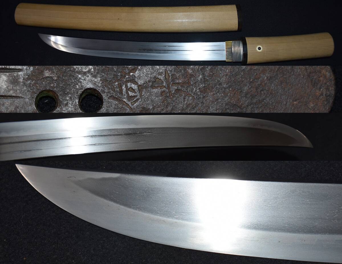 > 初だし品!在銘「盛光」備前の名工・室町前期・ダンビラ 寸伸び短刀・豊前茎の豪壮刀!備前乱れ刃紋・研ぎ済み美品・三つ棟造り・棒樋
