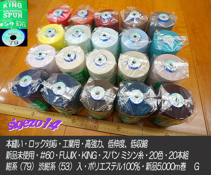 - 最終 G 新品未使用 #60 スパン KING ポリエステル 工業用 ミシン糸 20色20本組 黒系 紺系入 本縫 ロック 5.000m巻 リメイク 手芸 洋裁
