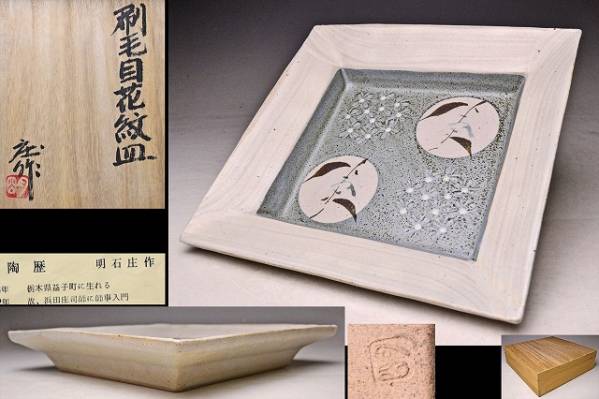 - 明石庄作 ★ 刷毛目花紋角皿 ★ 共箱栞 ★ 登窯作 ★ 検 人間国宝 浜田庄司