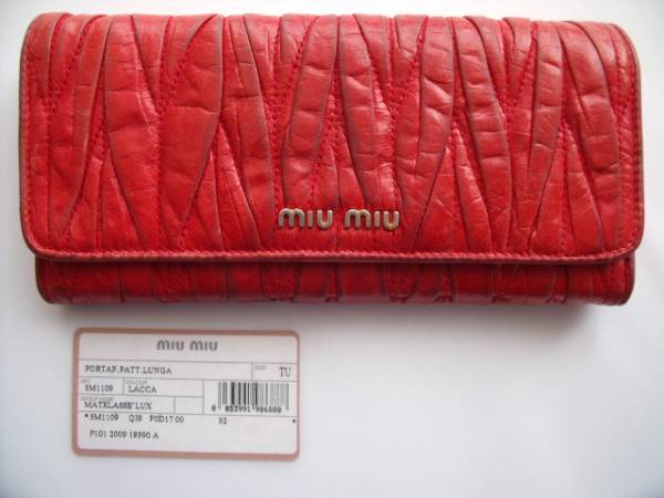> $ 良好品 $ ◆ ミュウミュウ ◆ miumiu ◆ マテラッセ レザー製 ・ 2つ折り 長財布 ◆ 赤 レッド系 ◆ 正規 カード付き ◆ 送料無料!!