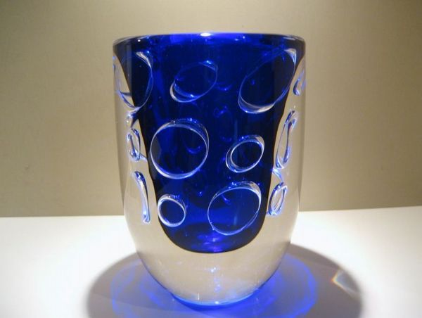 シンプルなデザインですが、コバルトブルーの色合いは深みがあり、ランダムなリング状の気泡が幻想的な1品です。光の受け方、置く角度で様々な表情を見せてくれるのも魅力の1つだと思います。シンプルな作品なのでいかなるカテゴリーのインテリアとも相性のいい、実用としてはもちろん、窓際において飾るだけでも楽しめる品物だと思います。北欧ガラスがお好きな方、そうでない方もぜひご検討ください。