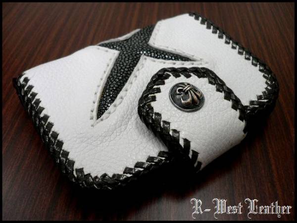 - 牛革×エイ革スティングレイ十文字ブラック レザーウォレット白/ショートtype革財布
