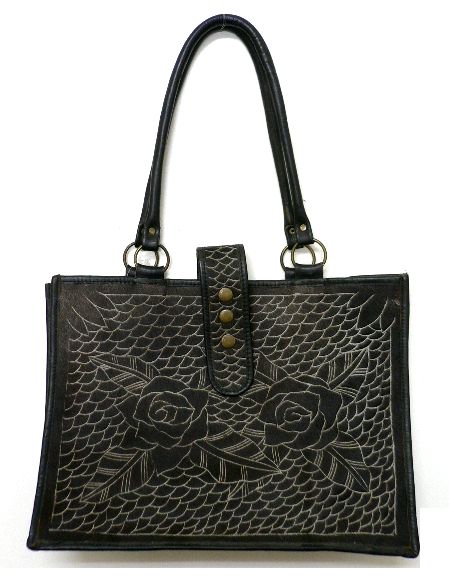 - 牛革×本ハラコ両面 薔薇カービング ハンドバッグ黒毛 手彫り1点モノ/訳有品のため50%OFF