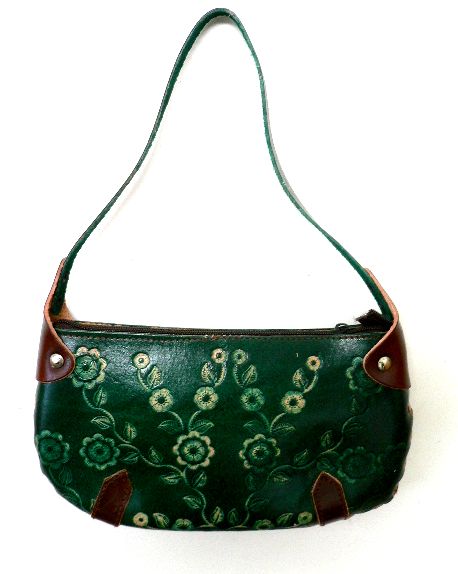 - 牛革 花柄 両面 型押し ハンドバッグ/緑/レザーバッグALL20%OFF