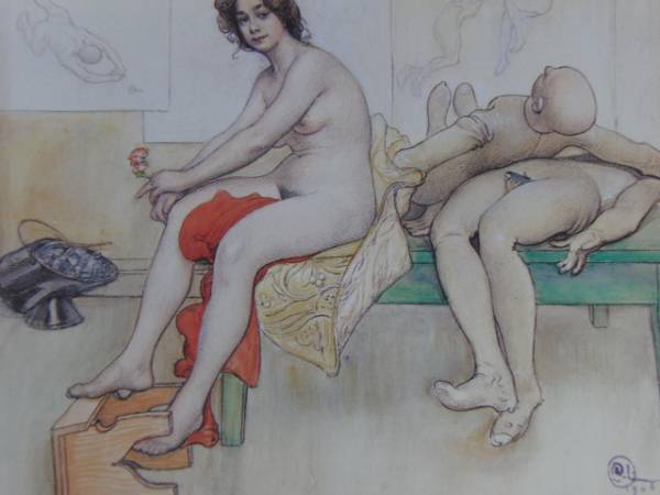 - カール・ラーション、モデル台にて、希少画集画、新品額装付、状態良好