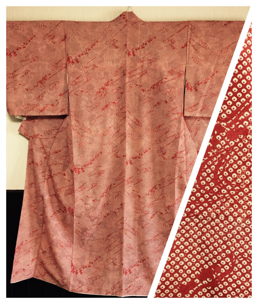 - 【小紋】正絹 袷 身丈144cm 緋色 胴裏は綿 普段着に
