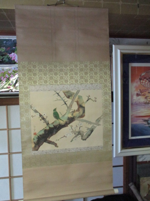 ★掛軸★白桑★花鳥図・梅★絹本★サイン・落款あり★