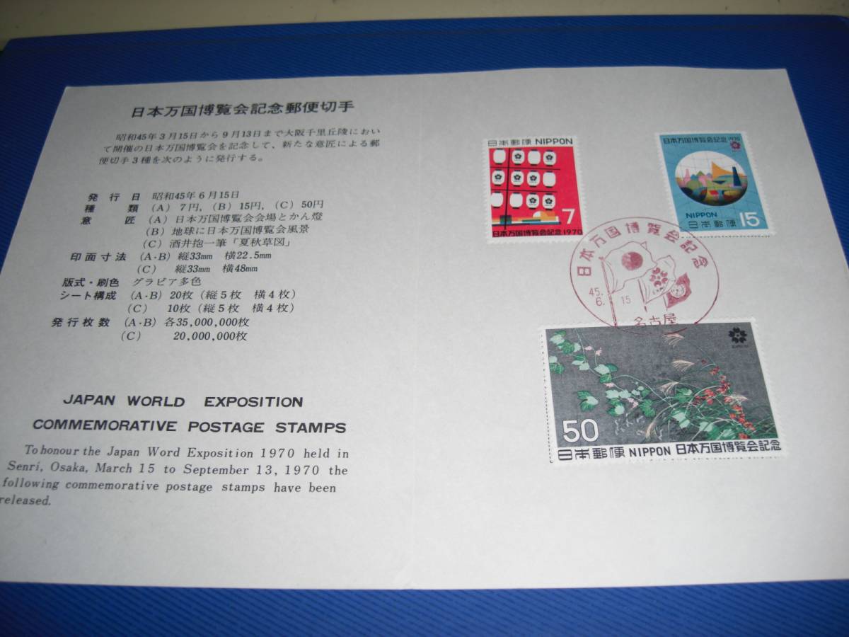 - 昭和45年 日本万国博覧会 記念郵便切手 押印 3種 説明カード 初日カバー