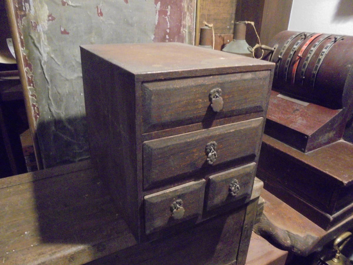 - 【無垢材の3段引出し】木製文具事務書棚ウッド収納ケース古道具アンティークインテリアインダストリアル観葉植物ドライフラワーレジ台