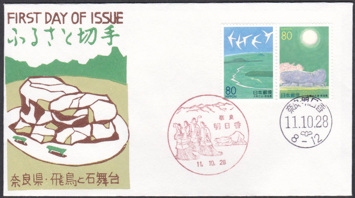 - FDC 1999年 ふるさと切手 奈良県 飛鳥と石舞台 P貼2消し 松屋