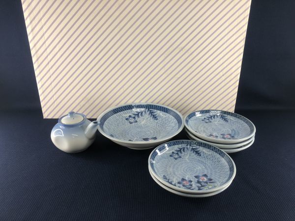 - 未使用品★ 高峰 漬物セット 醤油差し 1客 中皿 1枚 小皿 5枚 セット 花柄 青 箱あり管理1805 I-14
