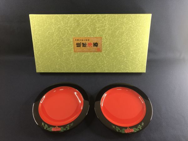 - 未使用品★ 沖縄伝統工芸 琉球漆器 内朱 ハイビスカス 唐草 縁太皿 箱あり管理1807 N-2