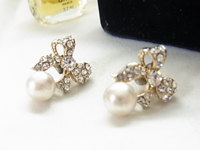 - 可愛いリボンのキュービックジルコニアにパール調ストーンの素敵なデザインのピアス♪