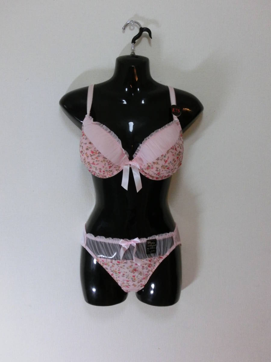 - ☆P188ピンク地に赤の花柄♪縁取りのレースが可愛いブラ&ショーツ(E75)ショーツL☆