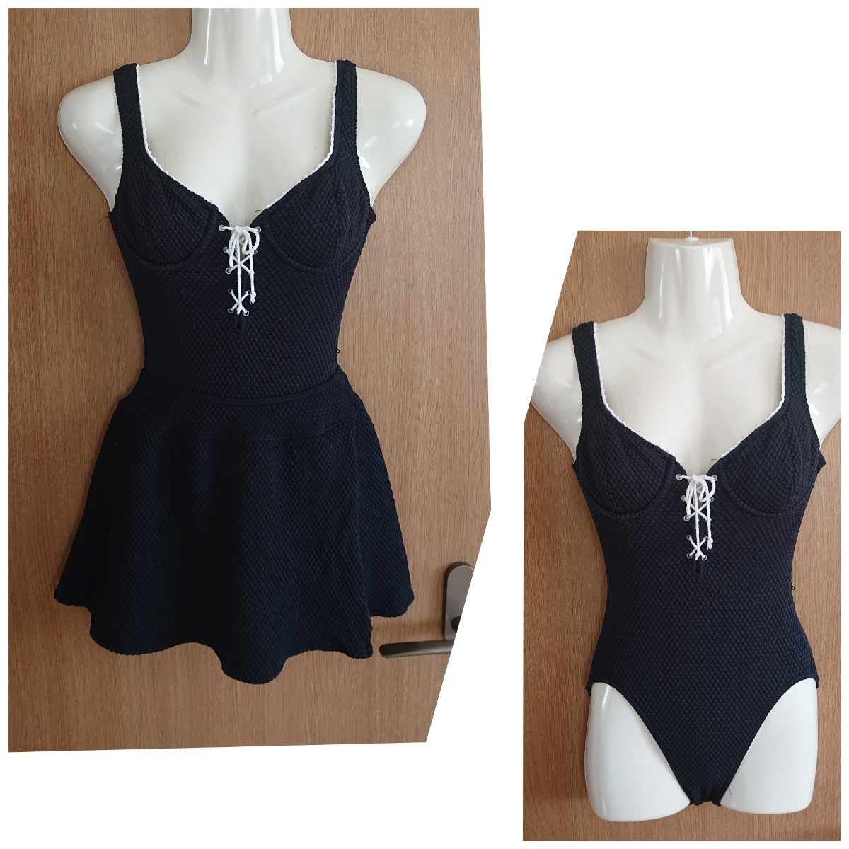 - ☆marie claire☆黒系ワンピース水着2点セット☆ミニスカート付き☆9M☆日本製☆マリ・クレール☆編み上げデザイン☆