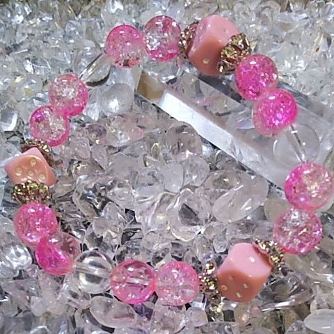- パワーストーン クラック水晶 風水 ハンドメイド ブレスレット ピンク サイコロ