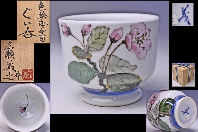 > 広瀬義之 ★ 色絵 海棠之図 ぐい呑 ★ 共箱 ★ 師:人間国宝 藤本能道 ★ 酒器 ★ 見事な絵付で飾っても映える逸品 ★ 廣瀬義之