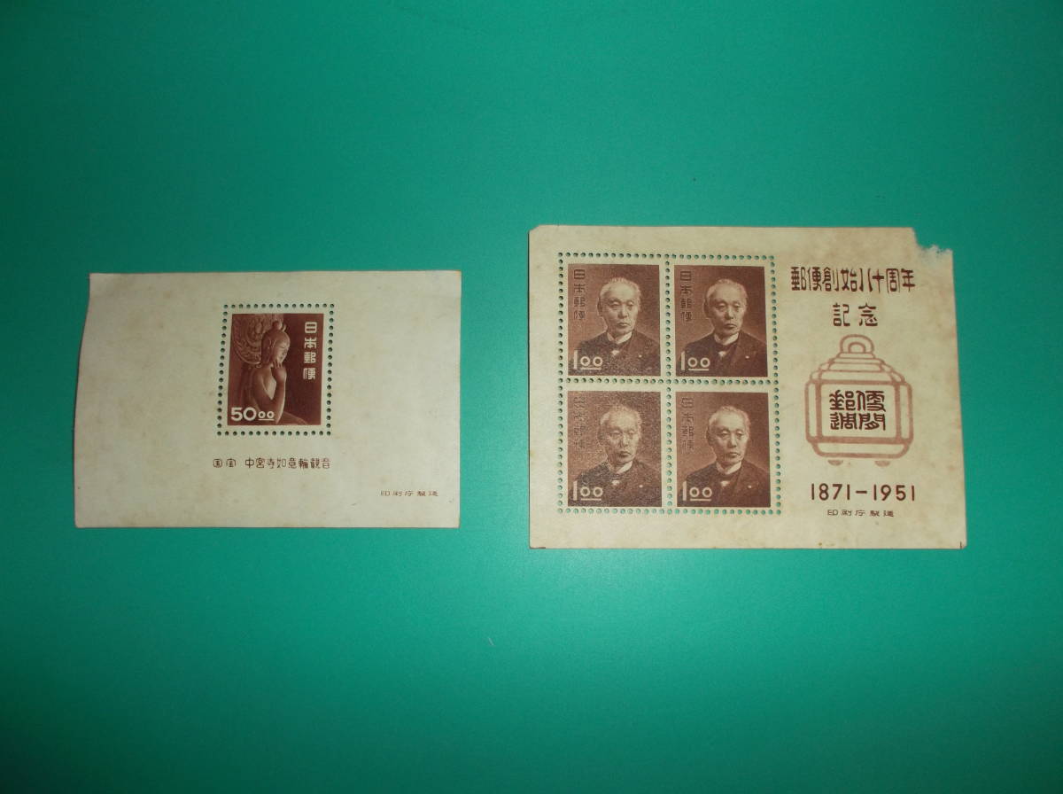 - 切手小型シート2枚組 国宝中宮寺如意輪観音 1951.5.1 郵便創始80年 1951.4.14