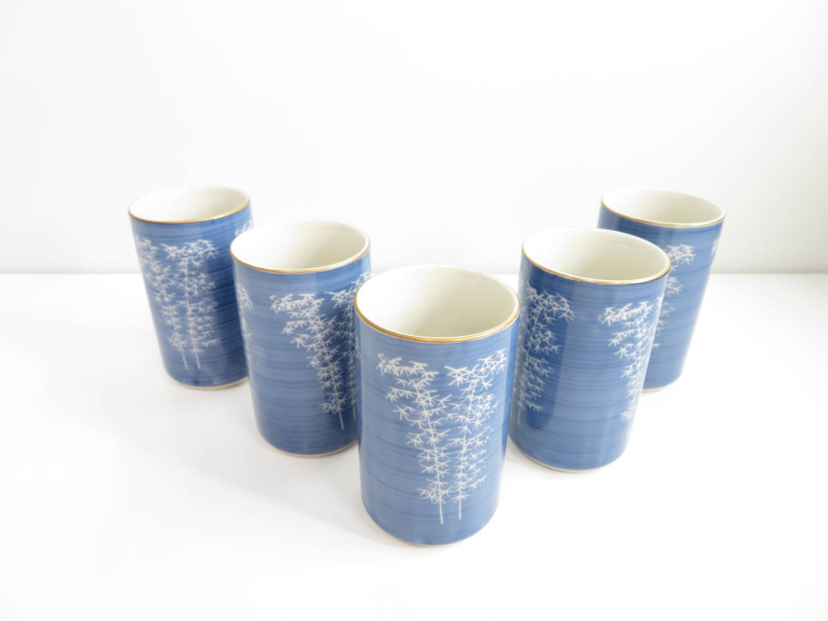 - ◆たち吉 橘吉 湯呑み 5客セット 創作陶器 茶器 和食器 青 草柄 極美品 管理2003 R-5