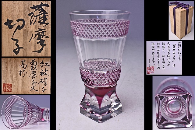- カメイガラス ★ 紅被硝子面取鹿の子文ぐい呑 ★ 共箱栞 ★ 江戸びいどろ 薩摩ガラス ★