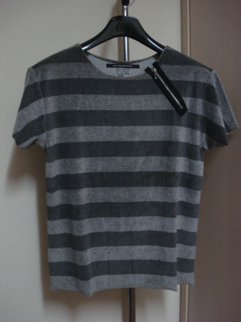 > 格安廃版レア・TRICKY MOUNTAIN PROJECT(トリッキーマウンテン)・グレー系ベロア風ボーダー地・高級半袖ジップデザイン付きTシャツ 38 M位