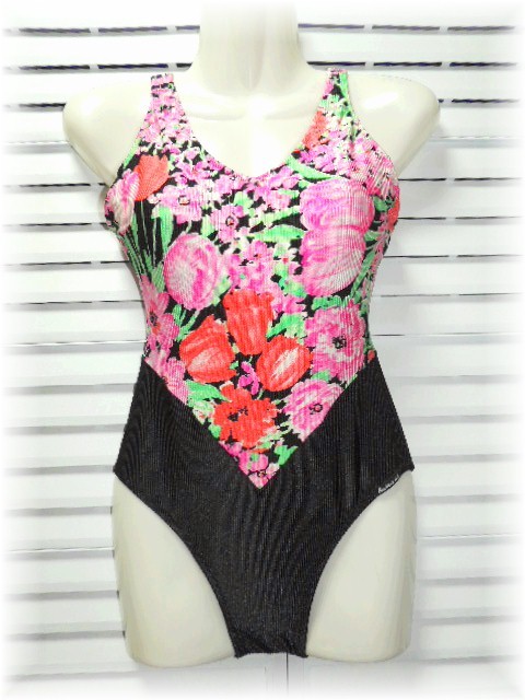 - Rose Marie Reicl 日本製 バックレースアップ ワンピース水着 9号/M ブラック×花柄