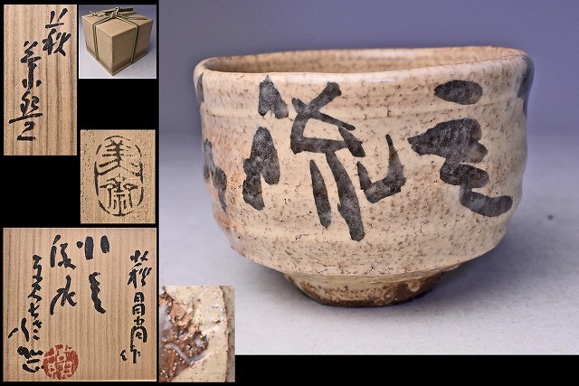 > 兼田昌尚 ★ 清水公照:文字 ★ 萩茶碗 ★ 清水公照:書付箱 指物師 か:美斎 ★ 茶映りの良い釉景に清水氏の文字が景色となった逸品 ★