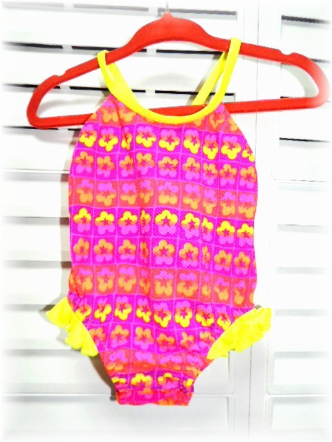 - 海外製品 フリル飾り バッククロス ワンピース水着 1歳用 ピンク系×蛍光イエロー・花柄