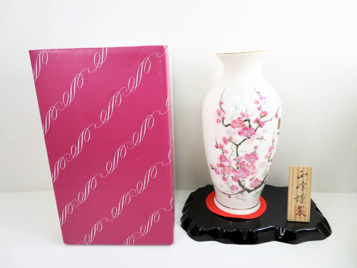 - 未使用品▲正峰 花瓶 花さし 花器 台付 梅 うぐいす 銘あり 箱あり 管理2012 倉庫1