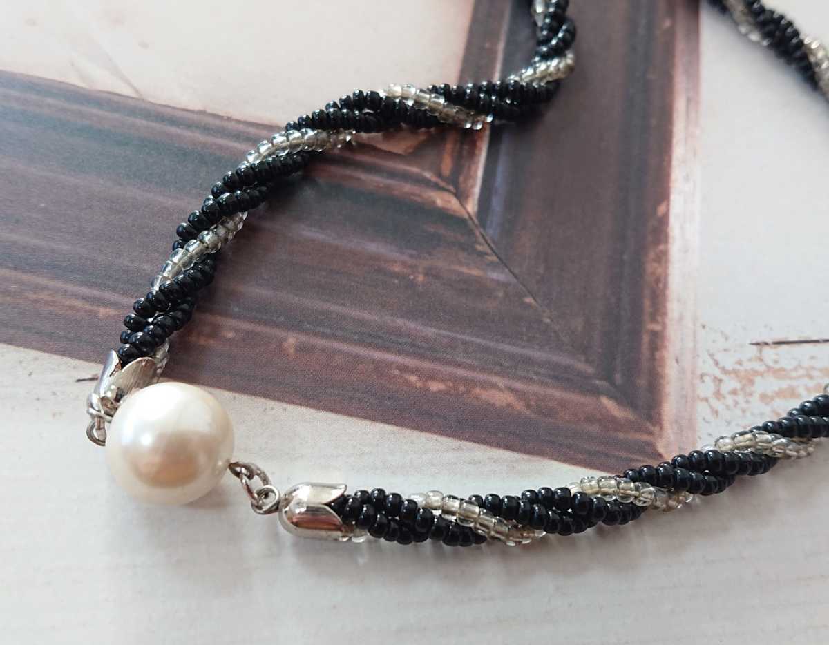 - □シックな印象□黒×白ツイストデザイン&1粒パールビジューのネックレス□