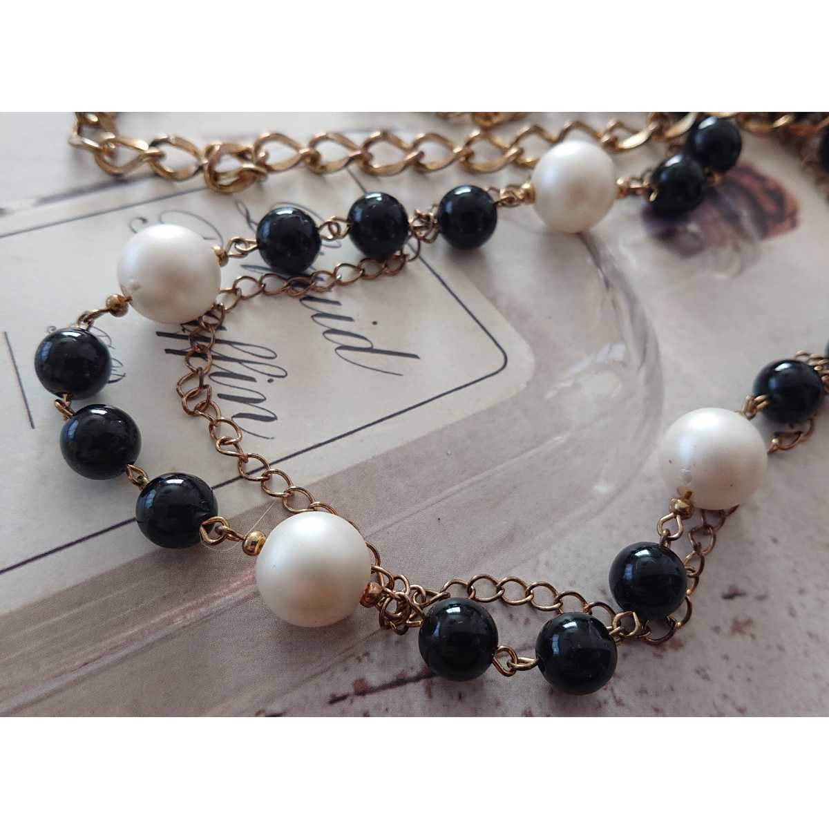 - □エレガント□パールホワイト&黒ビーズの2連ロングネックレス□ゴールドカラ―チェーン□